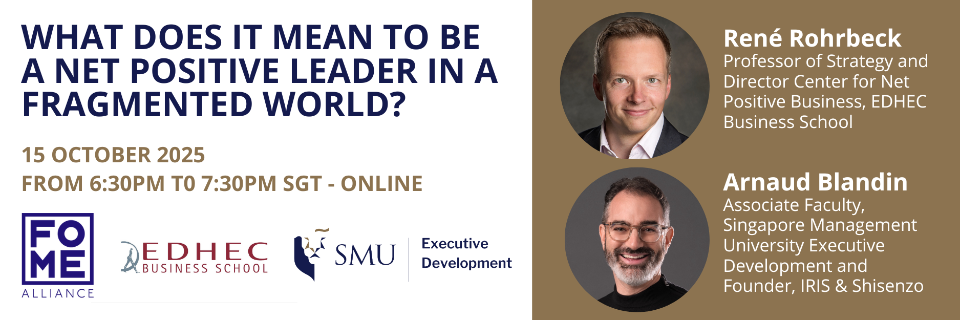 Join us on Wednesday, 15 October 2025 at 6:30PM SGT for a thought-provoking online conversation hosted by François Bogacz, Head of Learning and Innovation at Singapore Management University Executive Development with panelists Arnaud Blandin (Associate Faculty, SMU ExD and Founder, The Beyond Institute) and René Rohrbeck (Professor of Strategy and Director Center for Net Positive Business, EDHEC Business School).
